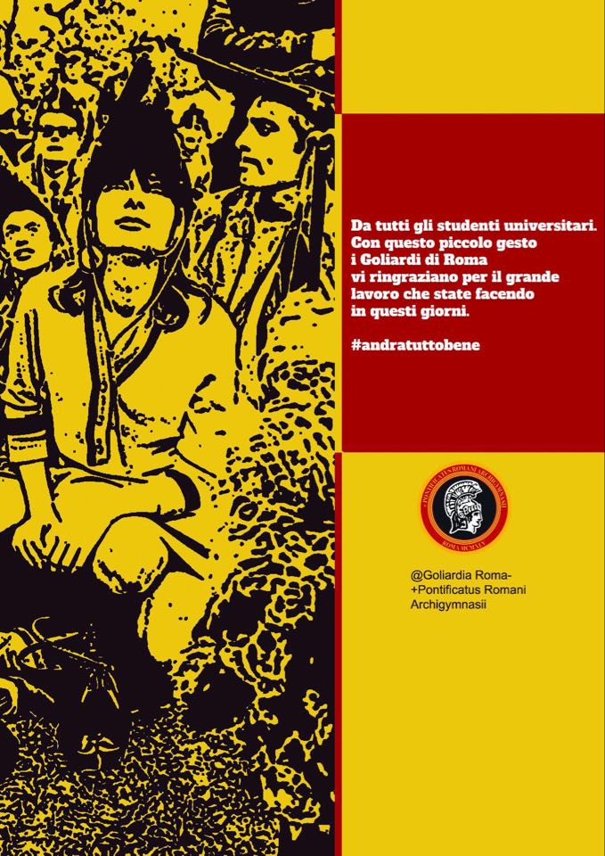 Gli studenti universitari del Pontificatus Romani Archigymnasii infatti, con a capo Andrea Giangeri, alias Enea dalle Bande Nere Rugantino III Papa Peroni Romanus Pontifex Maximus De lo +Pontificatus Romani Archigymnasii , stavano da giorni raccogliendo denaro per ringraziare a modo loro i medici e tutti gli operatori sanitari che in prima linea stanno combattendo con l'emergenza Coronavirus.